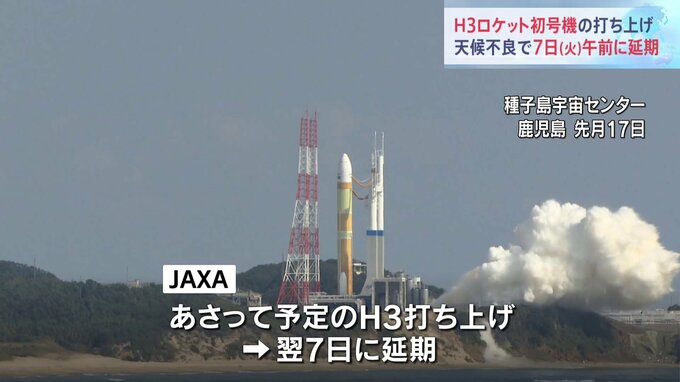 JAXAはきょう、鹿児島県の種子島宇宙センターで、あさって予定されていた日本の新型主力ロケット「H3」の打ち上げについて、翌7日に延期すると発表しました。理由について、「天候不良が予想されるため」としてい…