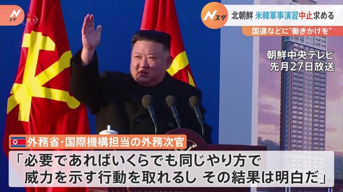 アメリカ軍と韓国軍による定例の合同軍事演習を前に北朝鮮が国連と国際社会に対し、即時に中止させるよう求める談話を発表しました。北朝鮮外務省・国際機構担当の外務次官は5日、国営メディアを通じて発表した談…