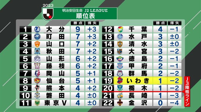 順位表です。いわきは19位に後退しました。21位以下はJ3への降格圏です。まだ3試合ですが、巻き返しに期待です。次の試合は今度の日曜日、アウェーでベガルタ仙台と対戦します。