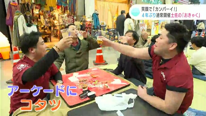 春の恒例イベント=土佐の「おきゃく」が、4日から始まりました。通常開催は4年ぶりで、訪れた大勢の人たちが久しぶりのおきゃくを楽しみました。「ここに人あり自由あり龍馬の国土佐のおきゃくが始まるぜよー!」…