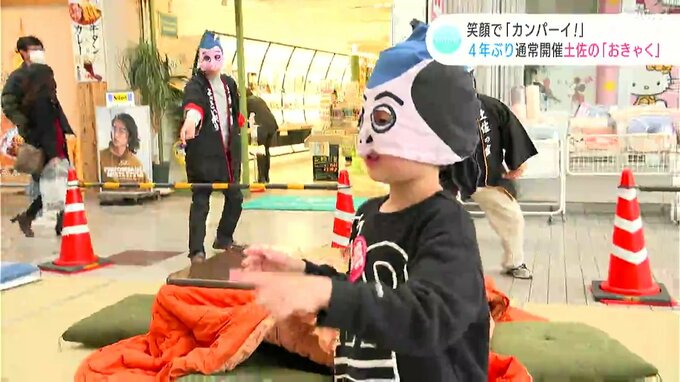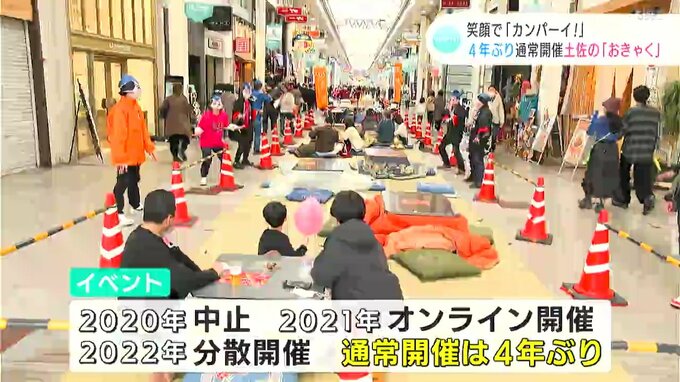 毎年3月に開かれている土佐の「おきゃく」。新型コロナの影響で2020年から中止、オンライン開催、分散開催となり、通常開催は4年ぶりです。この日は、商店街のアーケードにコタツが構えられるなど11のイベントが開かれました。