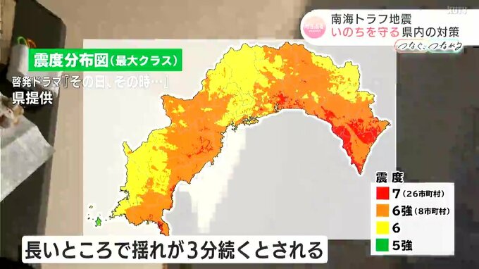 30年以内に70%から80%の確率で発生すると言われている南海トラフ地震。最大クラスの地震が発生すれば高知県内26の市町村で震度7、そのほかの市町村でも震度6以上の強い地震が起きる可能性があり、長いところでは揺れが3分以上続くと想定されています。