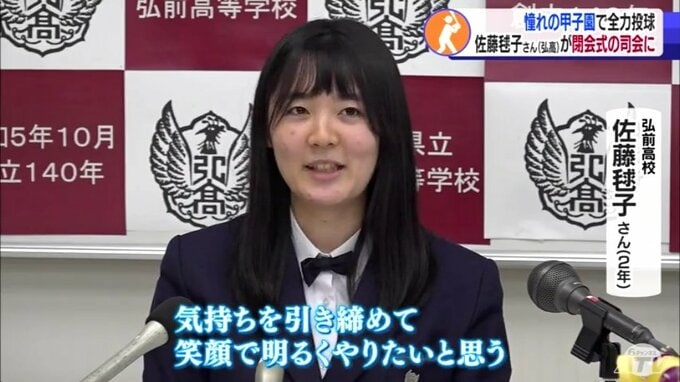 閉会式の司会を務めることが決まったのは弘前高校の放送局に所属する佐藤毬子さんです。佐藤さんは2022年7月の全国高校放送コンテストのアナウンス部門で準優勝に輝いていました。去年のセンバツでは青森明の星高校の女子生徒が開会式の司会を務めていて、青森県勢が2年連続で甲子園で大役を務めます。会見ではさっそく報道陣に求められ自慢の声を響かせました。