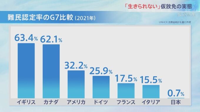 ペニャさんは難民申請をしているが、日本で認定されるのは申請者のたった0.7%。難民認定率が60%を超えるイギリスやカナダと比べると極端に低く、G7の中でも最下位だ。