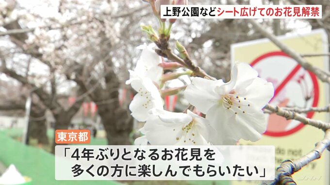 東京都は上野公園など都立公園でのシートを広げてのお花見について、4年ぶりに自粛を求めない方針を決めました。東京都は新型コロナの感染拡大防止のため、2020年から去年までの3年間、上野公園などの都立公園でシ…