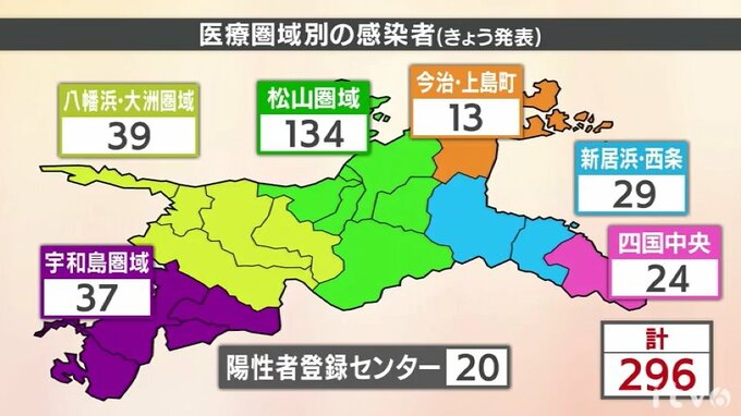 新型コロナウイルスについて愛媛県は7日、新たに296人が感染したと発表しました。医療圏域別では、松山市とその周辺が134人、八幡浜市・大洲市とその周辺が39人、宇和島市とその周辺が37人、新居浜…