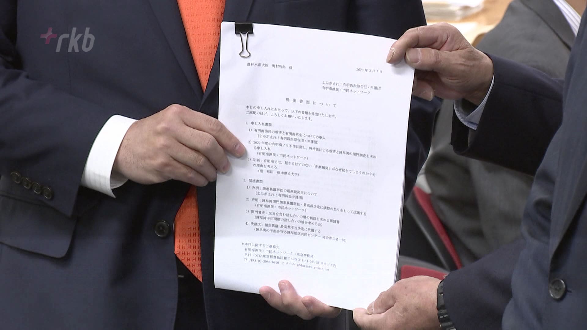 農林水産省を訪れたのは、国に排水門の開門を求めていた佐賀県の漁業者とその弁護団です。要請書では、今シーズンの有明海の養殖ノリについて、赤潮による色落ちや暴風による被害で、生産される枚数が前の年の5割から6割以下にとどまり、被害が2000年度の大不作を上回る可能性がある、と指摘。国に対して漁業者への損失補填などの「緊急救済」を求めています。