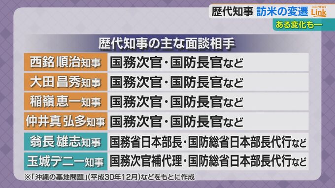 西銘知事から仲井真知事までは、国務長官や国防長官など、トップが対応していましたが、翁長知事以降、国務省は日本部長、国防総省は日本部長代行などに留まっています。