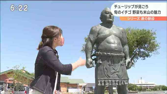「私は、江戸時代に活躍したこの道の駅がある米山町出身の第3代横綱丸山権太左衛門。おいしいものをいっぱい食べてゆっくりしていきなさい」