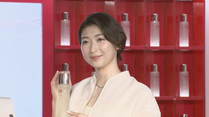 さらに池江さんは非接触型肌測定機で、肌年齢などを測定。実年齢の22歳より7歳も若い「15歳」という診断結果に、会場からはどよめきが起こりました。