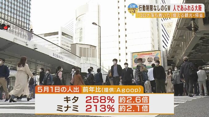 スマートフォンの位置情報を活用した「Agoop」のデータによりますと、大阪ではキタ・ミナミとも人出は去年の同じ時期に比べ2倍以上に増えたということです。
