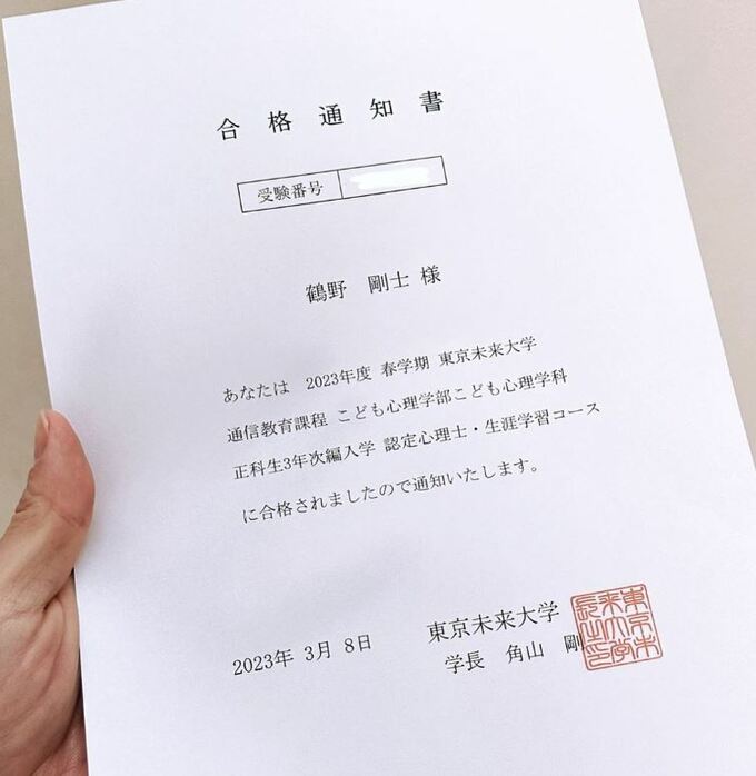 つるのさんは「合格通知書」写真をアップし「4月からもうすこしだけ学ばせていただきます #3年次編入 #通信教育課程 #50歳直前の卒業を目指して」と、その思いを綴っています。