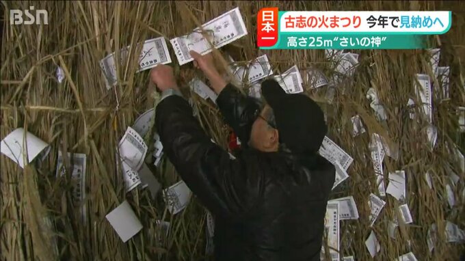 高さ日本一の“さいの神”で知られる新潟県長岡市山古志地域の『古志の火まつり』が、35年の歴史に幕を閉じることになりました。まだ多くの雪が残る長岡市山古志地域の雪原にそびえ立つ、高さおよそ25mの「さいの…