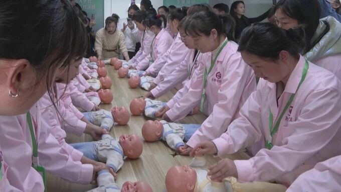 中国では、少子化が進む一方、子どもに関するある職業が人気を集めています。先生「胸を広げて、1、2・・・」おそろいのピンクの服を着た女性たちが身を乗り出して、真剣な表情で赤ちゃんの人形の手足を丁寧にマッサ…