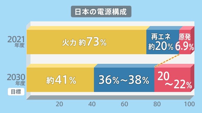 いまの日本の電源構成は、火力発電が7割を超えていますが、2030年には、気候変動対策として、脱炭素社会の実現ということで減らしていかなければいけない。再生可能エネルギーを増やし、そらにそれでも足りない分を原発を使っていくという狙いがあります。
