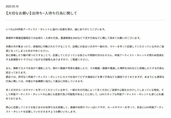 EXILEや三代目 J Soul Brothers from EXILE TRIBE、THE RAMPAGE from EXILE TRIBE、FANTASTICS from EXILE TRIBEなどの人気グループが所属するLDHが公式サイトを更新し、一部ファンの出待ち・入待ち行為などに関して注意喚起を行いました。