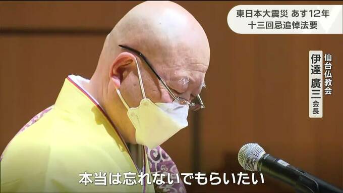 仙台市内では10日、十三回忌の追悼法要が行われました。十三回忌は仏教では一つの節目とされ、法要で導師を務めた仙台仏教会の伊達廣三会長は、「伝え続けることの大切さ」を説きました。仙台仏教会 伊達廣三会長…