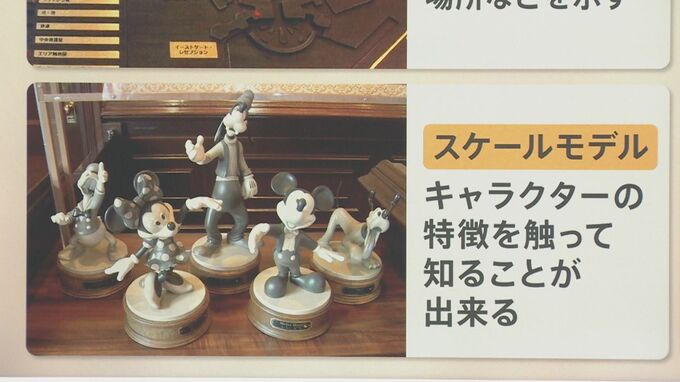 さらに「スケールモデル」というものもあり、こちらはキャラクターの特徴を触って知ることができます。目が見える人にとってミッキーの顔はわかるかもしれませんが、目が不自由な方でも触ることでミッキーの顔の形を感じ取ることができる。しかもモデルがそれぞれみんな手を出していて、握手もできるという工夫もあります。
