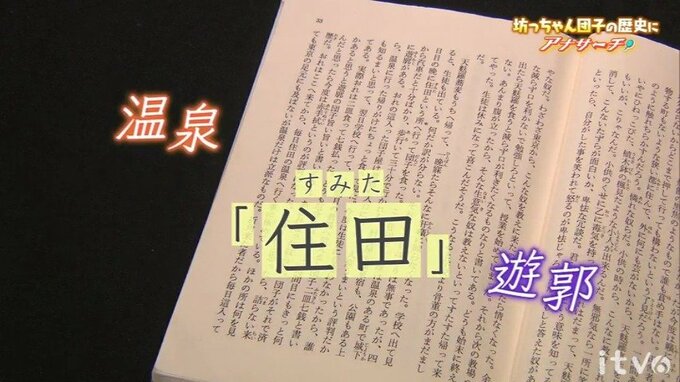 「住田という所へ行って団子を食った。この住田という所は温泉のある町で城下から汽車だと十分ばかり歩行いて三十分で行かれる(中略)おれの這入った団子屋は遊郭の入口にあって、大変うまいという評判だから温泉に行った帰りがけにちょっと食ってみた」(小説『坊っちゃん』より)