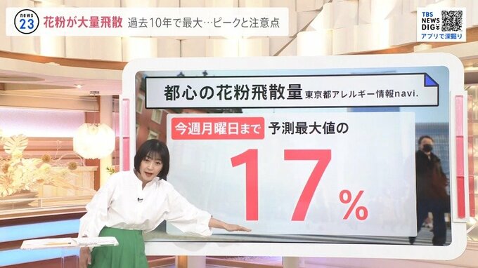 今シーズンどのくらい飛散するのか、予測の最大値があるんですが、東京都心では、2月27日時点でわずか5%でした。その後、暖かい日が続いたこともあり、3月6日の数字で17%まであがりました。