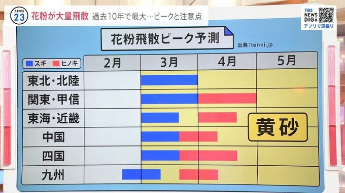 このピークが終われば安心というわけでもありません。この後、4月にかけてヒノキ花粉のピークがやってきます。さらに、3月から5月にかけてピークとなる黄砂の飛来が重なると、花粉症の症状が悪化すると言われているのでこちらも注意が必要です。