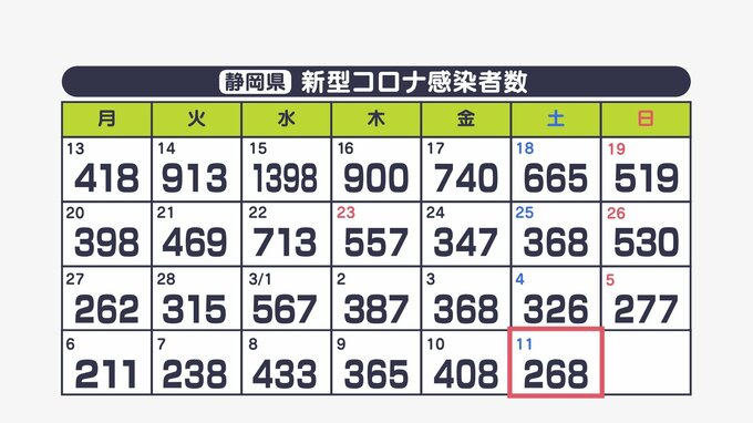 静岡県内では3月11日、新たに268人が新型コロナウイルスに感染したことがわかりました。1日あたりの感染者数は、地域別では、静岡市で71人、浜松市で26人、そのほかの市や町で171人となっています。
