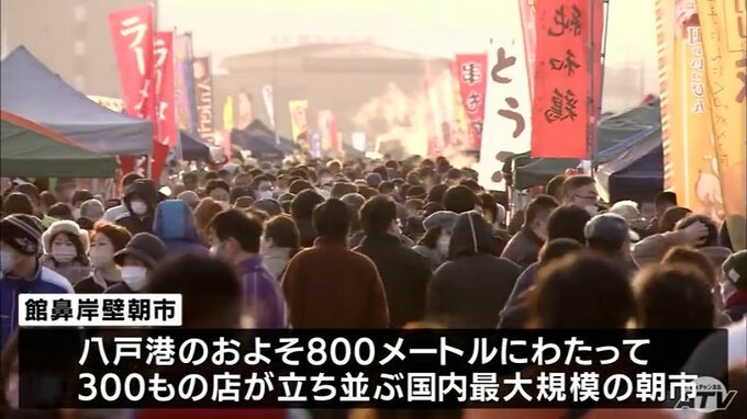 国内最大規模の朝市=青森県八戸市の館鼻岸壁朝市が12日からはじまり、日の出前から大勢の人で賑わいました。館鼻岸壁朝市は八戸港のおよそ800メートルにわたって野菜や魚介類、それに地元で人気の飲食店など300も…
