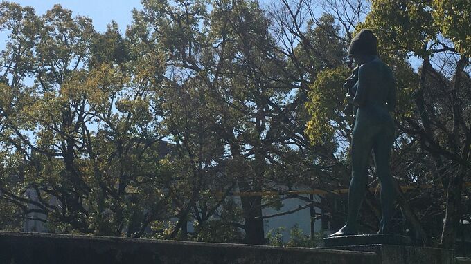 日陰紋様が美しい小径を進むと、木立の中に見上げるほど立派なブロンズ像(作者不詳)がある。