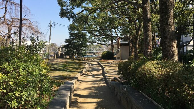 城下交差点からほど近い石山公園は、木々がしっかり茂っていて、後楽園や岡山城に向かう観光客にとっては別世界への扉を開けるエントランスホールだ。