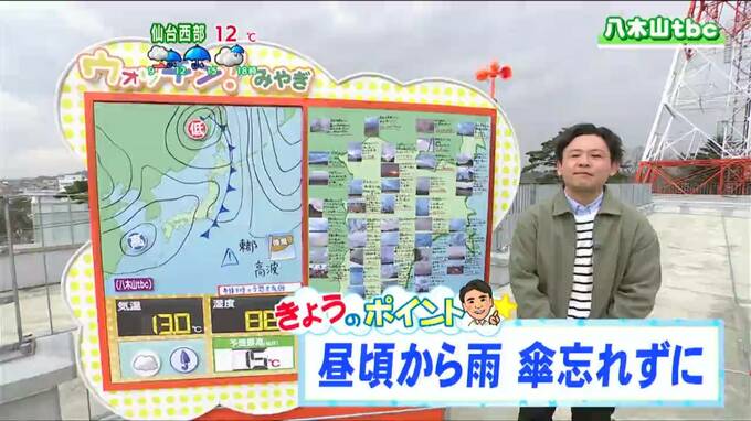 3月13日月曜日、宮城の30秒天気です。tbc気象台、今野佳吾気象予報士がお伝えします。「きょうは前線が通過するため、昼頃から夕方にかけては各地で雨に。夜は晴れますが、気温が大きく下がりますので、服装を調節…