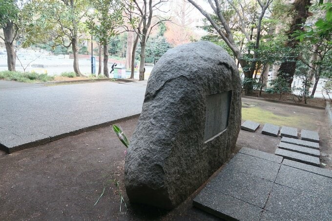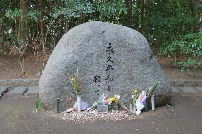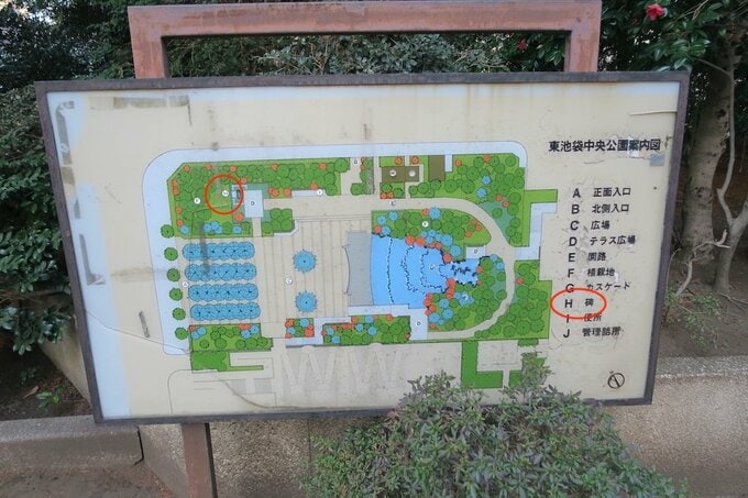 サンシャインシティの隣には東池袋中央公園という公園があります。そこにたたずむのが「永久平和を願って」と刻まれた石碑。しかし、公園の案内板には「碑」としか書いてありません。ここにはかつて巣鴨プリズンという施設があり、そこで東條英機元首相をはじめとするいわゆるA級戦犯たち7人が絞首刑となったのです。