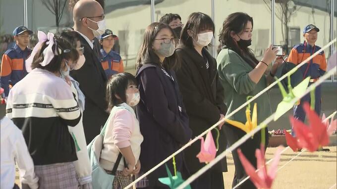 会場には、町民をはじめ、4月から町内に戻る義務教育学校「学び舎 ゆめの森」の子どもたちも集まり、羽にメッセージを書いた折り鶴を飾りました。
