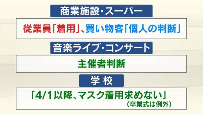また、音楽ライブやコンサートでは主催者の判断に従うことになるほか、学校では4月1日から「マスク着用を求めない」と国では示してます。