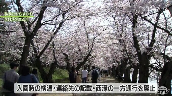まつり会場の弘前公園に入園する際の検温や連絡先の記載、それに桜のトンネルのある西濠(にしぼり)の一方通行を廃止するほか、アルコール類の持ち込みや販売を可能とし、飲食エリアはコロナ禍前と同様のスペースを確保するということです。一方で、本丸や北の郭(くるわ)など一部の場所での飲食と、園内での食べ歩きを引き続き禁止とします。