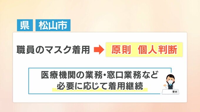 まず、県と松山市は職員のマスク着用について、13日から原則個人の判断としていますが、医療機関での業務や窓口業務を行う際など、必要に応じて着用を続けるということです。