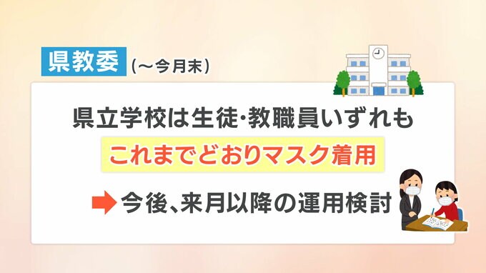 最後に県立学校についてです。県教育委員会は国の方針に従い、今月いっぱいは生徒・教職員いずれもこれまで通りのルールでマスクの着用を継続し、今後、国の発表を待ち、来月以降の運用を検討することにしています。
