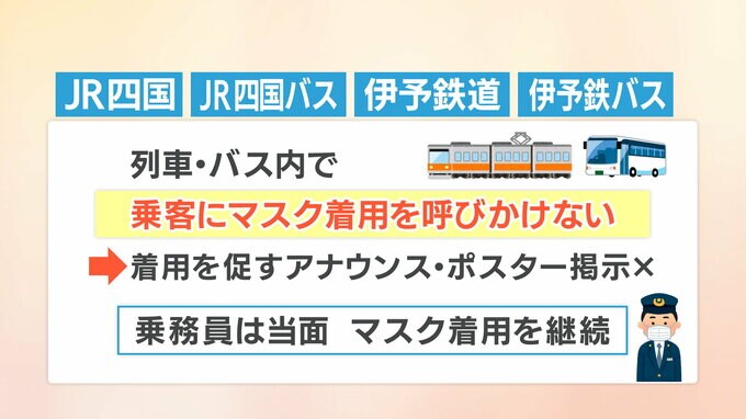 続いて、公共交通機関の対応です。JR四国や伊予鉄道などは、列車やバスの車内などで13日から乗客にマスクの着用を呼びかけず、いずれも、着用を促す車内アナウンスやポスターの掲示を取りやめています。
