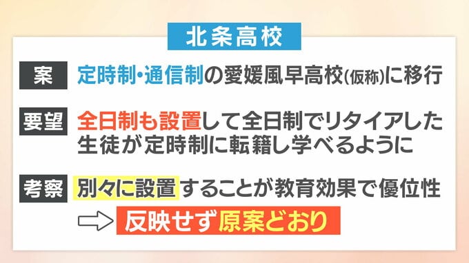 一方、定時制と通信制の仮称・愛媛風早高校に移行する案が示されていた北条高校についてです。要望として全日制も設置して全日制でリタイヤした生徒が定時制に移って学べるようにすることが挙がっていましたが、県教委は、他の県の聞き取りなどを踏まえ、別々に設置することが教育効果の面で優位性が認められるとして原案通りの計画で進めることを決めました。
