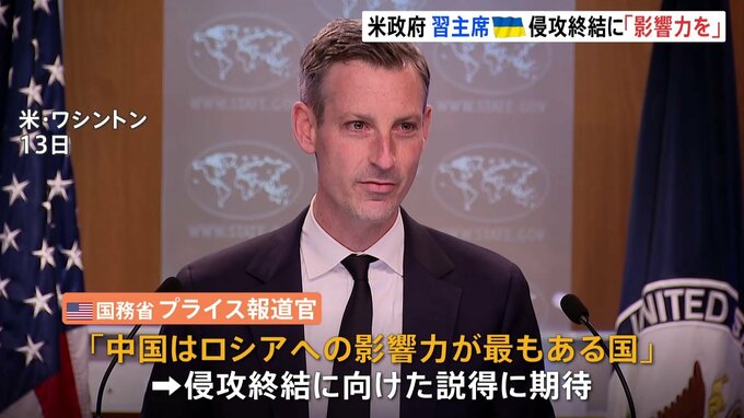 中国の習近平国家主席が来週にもロシアのプーチン大統領と会談し、またウクライナのゼレンスキー大統領とのオンライン会談も計画していると報じられたことについて、アメリカ政府は中国の働きかけに期待を示しまし…