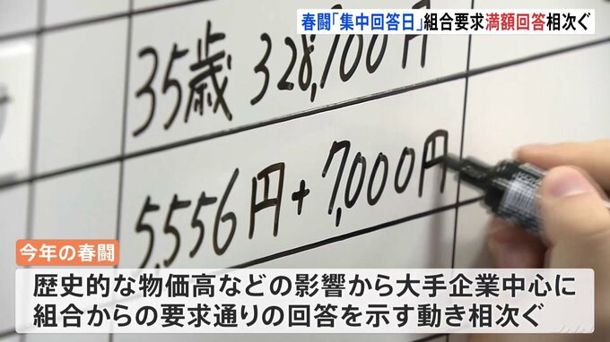 今年の春闘は15日、多くの企業で、経営側が労働組合に回答を示す「集中回答日」を迎えました。電機大手などでは歴史的な物価高を背景に、去年の水準を大幅に上回る回答が相次いでいます。今年の春闘では、歴史的な…