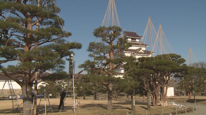 福島県会津若松市の鶴ヶ城公園では、冬の間に雪の重みから木の枝を守っていた「枝つり」を取り外す作業が行われています。
