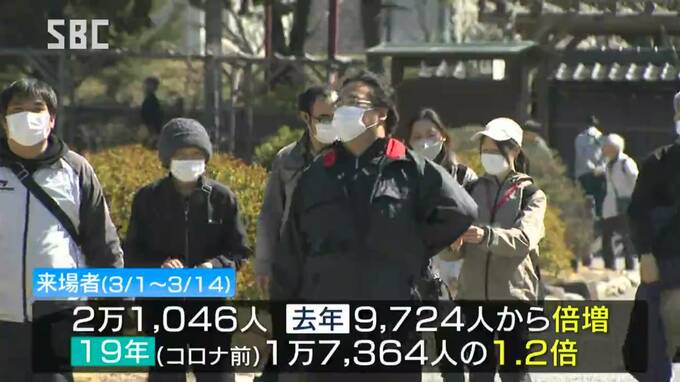 松本城管理事務所によりますと、観光客は堅調に推移していて、3月1日から14日までの来場者数は2万1000人余りと前の年の2倍以上に上り、コロナ前の2019年と比べても1.2倍に回復しています。