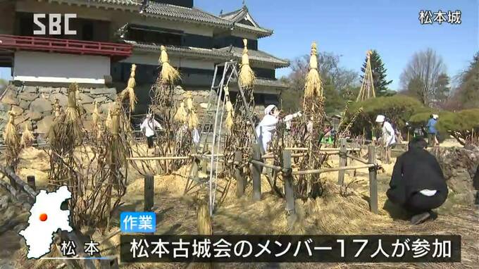 冬囲いの取り外しには、松本城の保存活動に取り組んでいる「松本古城会(こじょうかい)」のメンバー17人が参加しました。