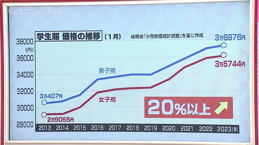 全国の平均価格は、2013年に男子が3万円、女子が2万9000円でしたが価格の上昇が続き、ことし1月時点では、男子が約3万7000円女子が約3万5800円で10年前と比べて2割以上、上がっているんです。