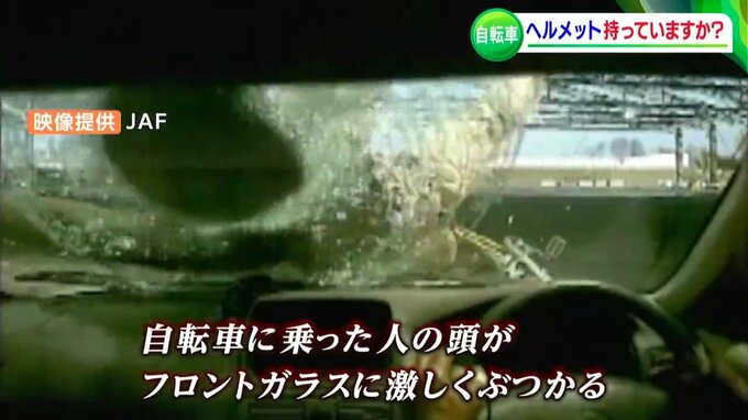 岡山県では、去年1年間で自転車に関わる事故が929件発生し、18人が死亡しました。亡くなった人はいずれも、ヘルメットを着用していませんでした。JAFの実験映像では、自転車と車が衝突した際に、自転車に乗った人の頭がフロントガラスや路面にぶつかるなどの危険にさらされるのです(【写真を見る】参照)。