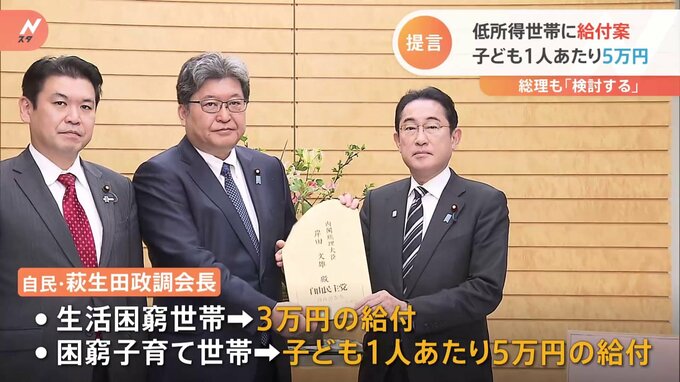 自民党の萩生田政調会長が先ほど、困窮する子育て世帯への子ども1人あたり5万円の給付など、追加の物価高対策を岸田総理に提言しました。萩生田氏は、所得が少なく生活に困窮する世帯を対象にした3万円の給付と、…