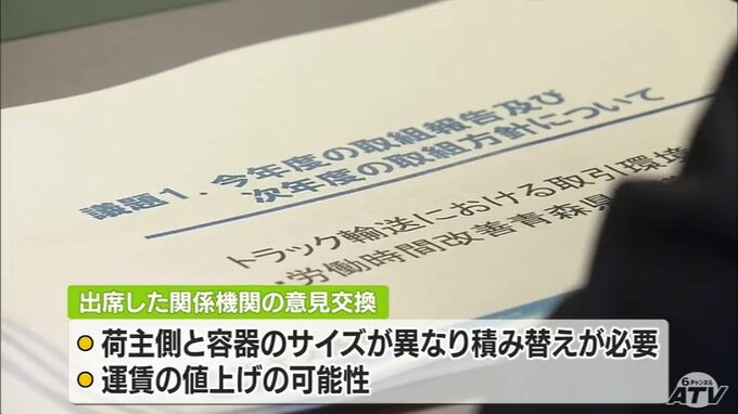 こうしたなか、青森市で15日に開かれた会議では関係機関や団体が出席し、荷主側と運送側で農産物を運ぶための容器のサイズが異なり、積み替えのために運転手が拘束されるといった課題や運賃に反映する可能性について意見が交わされました。