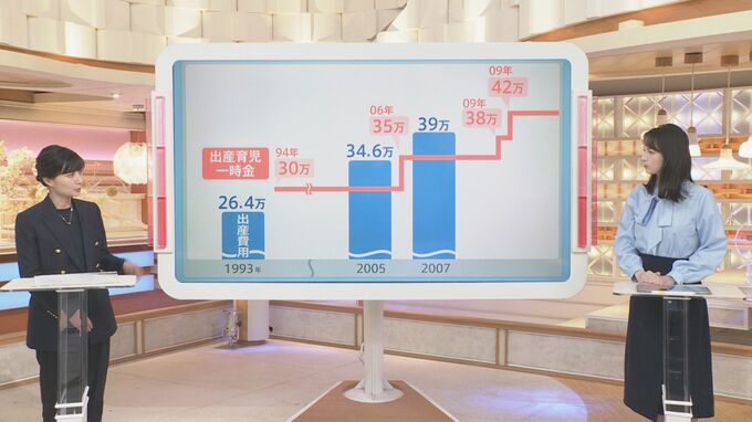 さらに、こうしたことも起きています。この出産育児一時金は約30年前の1994年に始まりました。その当時の出産費用26.4万円というのを踏まえた上で30万円から始まったんですね。ですが、2005年には出産費用がこの30万円を上回ってしまったということで、一時金が35万円に引き上げられました。ですがまた出産費用が上がる、さらに一時金を引き上げる…これがずっと繰り返されているんです。