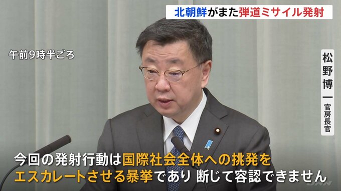 北朝鮮がけさ、日本海に向けてICBM=大陸間弾道ミサイル級のミサイル1発を発射しました。松野博一官房長官「今回の発射行動は国際社会全体への挑発をエスカレートさせる暴挙であり、断じて容認できません」きょう午…