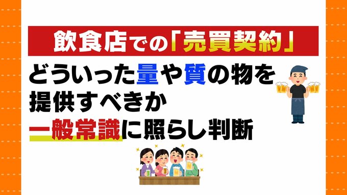 飲食店などで食べ物や飲み物を注文してお金を払う行為は、「売買契約」にあたります。生ビールを注文する際にいちいち契約書は作りませんが、このような場合は売り主と買い主との間で、どういった量や質の物を提供すべきなのかを一般常識に照らし合わせて、判断することになります。
